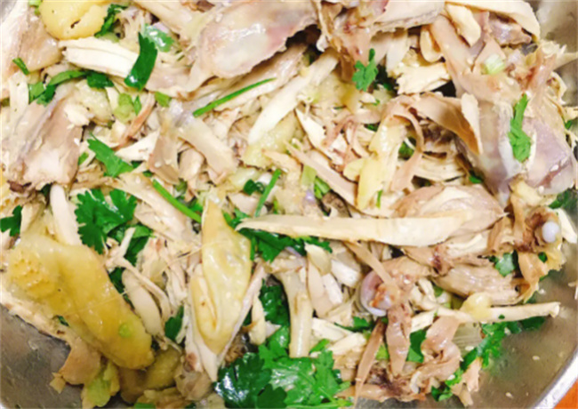 4、將煮熟的雞肉放涼后,用手將其撕成碎片,保留合適的大小。 5、腌料倒入撕好的雞肉中,充分拌勻,讓雞肉充分吸收腌料的味道。 6、撒上適量的熟芝麻,這樣手撕雞的香氣會更加誘人。如果您有條件的話,建議將制作好的手撕雞放入冰箱冷藏幾個小時,這樣能更好地融合味道,使其更加入味。