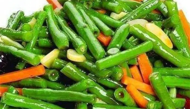 2.清炒長豇豆 準備長豇豆、胡蘿卜、大蒜、食鹽、雞精和水淀粉。將大蒜拍扁剁碎,將胡蘿卜切成與長豇豆差不多粗的小條。將長豇豆切段,熱鍋加油,下蒜末爆香,倒入胡蘿卜和長豇豆,大火翻炒均勻。加入食鹽、雞精,再淋入適量清水,蓋上鍋蓋燜煮5分鐘。開蓋后加入水淀粉,翻炒均勻即可出鍋。