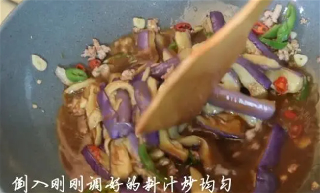 4、茄子泡在鹽水中時,可以準備姜蒜片和青紅椒圈。然后,起鍋加入寬油,燒至7成熱,把茄子放入鍋中炸制,待表面焦黃時,撈出晾涼瀝干油分備用。 5、倒掉鍋里的油,留下一點底油,加入姜蒜片和青紅椒圈,小火炒香。接著加入豬肉末,炒熟。6、最后,把炸好的茄子加入鍋中,倒入調好的醬汁,大火收汁至湯汁濃稠。撒上小蔥花點綴,就可以盛出上桌了。