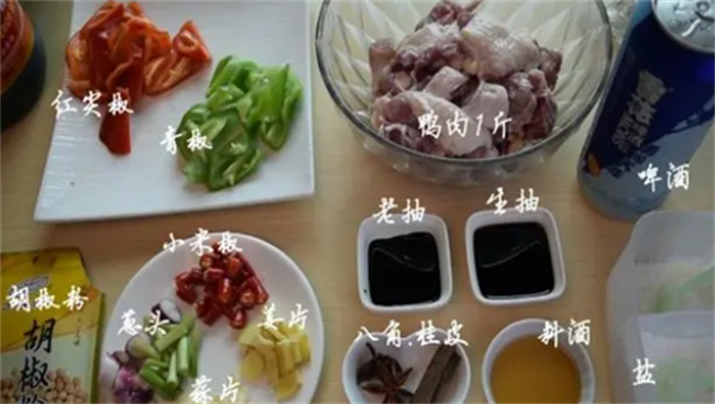 1、我們需要準備好食材:500克的鴨肉、1罐啤酒、青紅椒各1根、小米椒、姜蔥蒜適量,胡椒粉1茶匙、八角2顆、桂皮2小塊、老抽1茶匙、生抽2茶匙、食鹽1茶匙。鴨肉切成適量大小,用一些清水和料酒腌制一段時間,去除腥味備用。