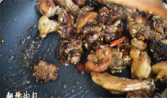 2、加油燒熱鍋,加入2個八角和2塊桂皮,小火炒出一股香味,然后加入蔥姜蒜小米椒等配料,小火卷炒散發(fā)出香味。之后加入腌制好的鴨肉,大火炒至水分收干出鴨油至鴨肉表面黃褐色。