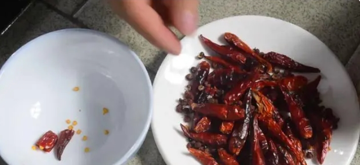 接下來,起鍋燒干,然后把準(zhǔn)備好的干辣椒和花椒倒入鍋中,小火炒香,炒至辣椒表面微焦即可,再盛出放涼,放涼后把干辣椒撕成小塊,把花椒捏碎,備用!這樣處理過的干辣椒和花椒會(huì)更香哦!