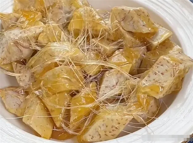 拔絲芋頭 【材料】 芋頭150克,綿白糖50克 【做法】 1、將芋頭去皮后改成1厘米寬,2 厘米長(zhǎng)的條; 2、鍋內(nèi)加入花生油,芋頭冷油下入鍋中,炸至金黃色撈出備用,3、鍋放少許油,下入糖炒至微黃,下入炸好的芋頭條迅速撤火翻勺,待糖液均勻裹上出鍋裝盤。