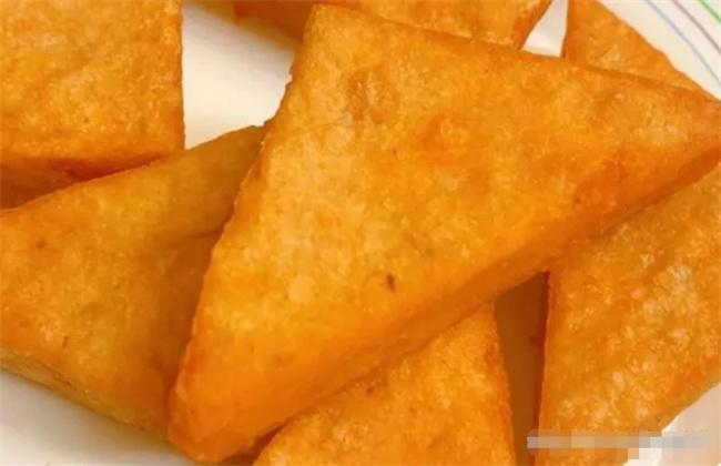 芋頭糕 1、芋頭去皮切片蒸熟壓成泥 2、200克粘米粉加300毫升水?dāng)噭蚣狱c(diǎn)鹽胡椒粉五香粉調(diào)味,加入芋頭泥攪拌均勻。 3、鍋中燒開300毫升水,水開后轉(zhuǎn)小火,邊倒邊攪入上面的面糊,不停翻炒直到濃稠抱團(tuán)。 4、方形模具刷油防粘,倒入面糊壓平整,上鍋蒸大火30分鐘,放涼定型。 5、切成三角形,油溫7成熱下鍋炸,不要翻動(dòng)直到定型再轉(zhuǎn)動(dòng),炸至金黃即可。