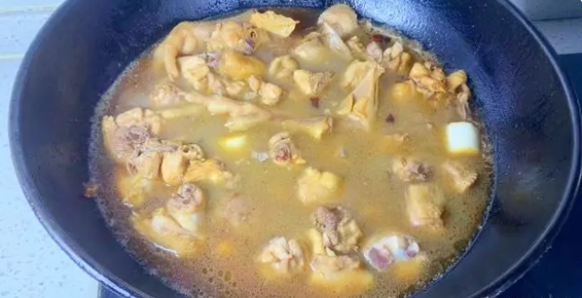 3、接下來往鍋內(nèi)倒入適量的溫水,沒過雞肉塊,大火把鍋中的雞肉塊煮開,再轉(zhuǎn)為中小火燉30分鐘。