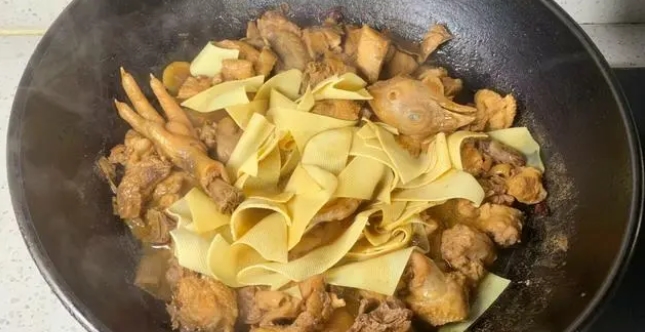 4、雞肉很容易燉熟,30分鐘后里面再放入切好的千張,或者放一些自己喜歡吃的配菜也可以,撒入適量的鹽,翻拌均勻,繼續(xù)小火燉10分鐘關(guān)火。關(guān)火后撒少許的蔥花點(diǎn)綴一下,盛出來上桌搶著吃即可,全家老少都愛吃。雞肉入味又鮮美,一點(diǎn)都不柴也不油膩,最后連湯汁都不剩,太好吃了。