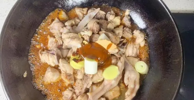 2、很多人燉雞肉的時候習(xí)慣用冰糖或者是白糖先炒一下上色,小編個人認(rèn)為炒過糖色的雞肉吃起來一點(diǎn)都不鮮嫩,反而有一種發(fā)柴的口感,直接略炒一下吃起來更鮮美。鍋中放少許的食用油,把控水后的雞肉塊倒入鍋中,先把里面多余的水分炒出來,最后放入2勺甜面醬、1勺料酒、2勺生抽、2勺老抽、蔥姜段、2個八角和香葉用鏟子不停的翻炒,炒至顏色均勻即可。