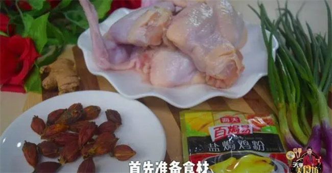 在開始正式制作之前呢,我們首先需要準備以下食材:雞翅8個,鹽焗雞粉20克,黃梔子30克,紅頭蔥5根,生姜2塊