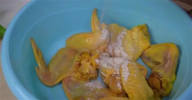 第三步:雞翅泡好之后,撈出瀝干水分,然后用毛刷刷上一層黃梔子水,讓雞翅變成金黃色,如果你沒有毛刷的話,可以直接倒在一起抓勻也是可以的,雞翅上色之后,再次控干水分,然后放到盆里,加入20克的鹽焗雞粉,我買的是1塊5一包的鹽焗雞粉,抓勻腌制入味就可以了,不用放其它多余的調味料!