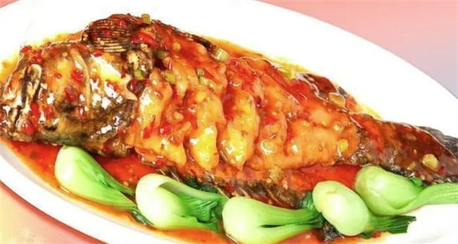 做法5:糖醋石斑魚 準(zhǔn)備食材如下:石斑魚1條,上海青50克,番茄醬3湯匙,甜辣椒3湯匙,生抽2湯匙,蠔油1湯匙,食鹽少許,淀粉適量,白糖20克 具體做法如下:上海青焯水后過涼,擺入盤中裝飾,再將石斑魚清理干凈之后,在魚身上兩面打上刀花,然后淋上料酒,涂抹均勻,再涂上少許食鹽,然后拍上一層淀粉,起鍋加入寬油,油溫6成熱時(shí),將石斑魚放入鍋中,中火炸熟至表面金黃酥脆,再撈出擺入盤中!準(zhǔn)備一個(gè)碗,加入番茄醬3湯匙,甜辣椒3湯匙,生抽2湯匙,蠔油1湯匙,食鹽少許,淀粉1湯匙,白糖20克,再加入1碗清水,攪拌均勻,再起鍋,將調(diào)好的糖醋汁放入鍋中,邊煮邊攪動(dòng),煮至湯汁濃稠,然后淋到石斑魚上面即可!