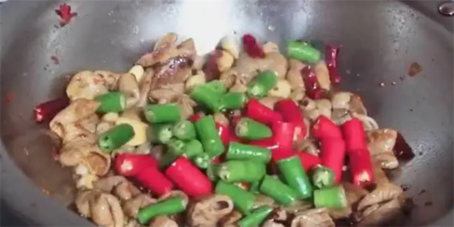 3. 將洗凈的肥腸放入高壓鍋中,加水,加入桂皮、八角、干辣椒、花椒等調(diào)料。蓋上鍋蓋,煮20分鐘至熟。 4. 將煮熟的肥腸切成小塊。熱鍋加油,加入姜片、蒜片爆香后加入肥腸。加入食鹽、生抽和老抽,用大火翻炒均勻。混合均勻后加入青紅椒段,再次翻炒均勻。