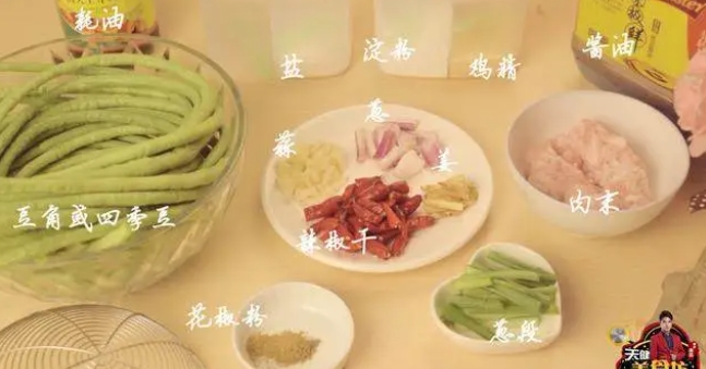 首先準備食材: 長豇豆或四季豆 X 500g;肉末 X 50g;蔥,姜,蒜,辣椒干 X 適量;蔥段 X 適量;花椒粉 X 少量耗油,鹽,雞精,醬油,淀粉 X 適量