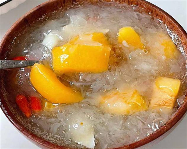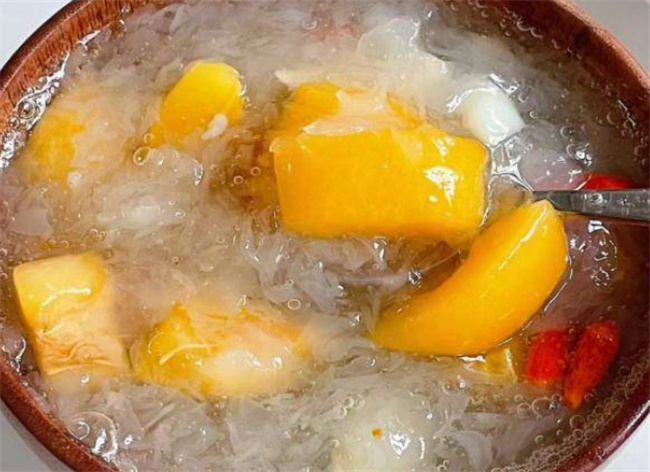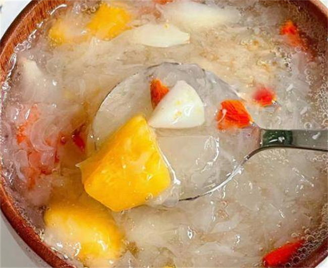 一、枇杷百合冰糖銀耳羹介紹 枇杷是一種水分足的水果,果肉非常肥美,汁水非常豐富。它含有多種維生素和礦物質,具有止咳潤肺,補水嫩膚的作用。百合是食藥兩用的食材,入肺經,能夠清理肺部的毒素,潤肺止咳,清心安神。銀耳是平民進補的食材,富含豐富的膠原蛋白,對皮膚有滋潤的作用,還可以改善我們的氣色,增強免疫。組合在一起,形成了這款滋補養生湯。
