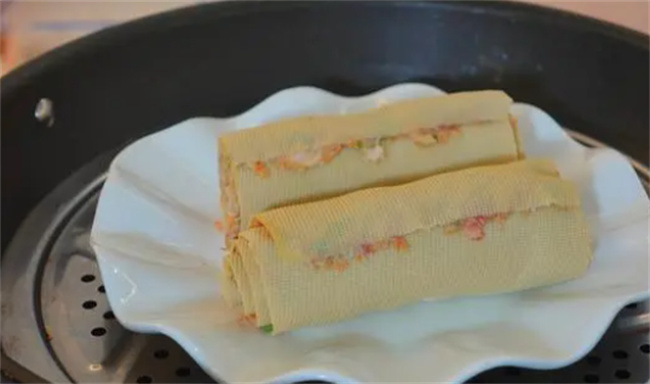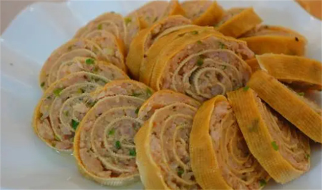 二、制作步驟 1、將豬肉清洗干凈,去掉肉皮,切成小塊。然后剁成肉末。將小蔥切成蔥花,一起放入大盆中,加入1茶匙食鹽、1湯匙生抽、1湯匙蠔油、1湯匙胡椒粉、2湯匙料酒、2湯匙淀粉,用筷子順時針攪拌均勻,攪拌至肉末起膠,再放入1小勺植物油,繼續攪拌均勻備用。 2、將豆皮鋪平到案板上,將調好的肉餡均勻地盛到豆皮上,然后用勺子鋪平,盡量鋪勻,再從豆皮的一端往另一端卷起來,卷成圓柱形狀。 3、將卷好的豆皮肉卷放入蒸鍋中,蒸鍋要先熱,用大火蒸15分鐘至熟。 4、待冷卻后,將豆皮肉卷切成約1.5厘米厚的厚a片,裝盤即可食用。
