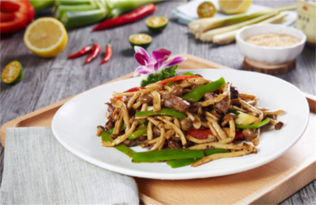 三、千葉豆腐 1、將千葉豆腐切成厚薄片,姜蒜切成蒜末,姜切成姜片備用。 2、熱鍋加入適量油,放入千葉豆腐,炒至體積兩倍大,撈出備用。 3、鍋留底油放入姜蒜和青紅椒圈炒香,倒入千葉豆腐,加入調料和水,蓋上鍋蓋燜煮。 4、煮干之后將千葉豆腐翻炒均勻,加入蒜葉炒勻即可。 四、空心菜肉沫 1、將空心菜梗切段,五花肉沫下鍋鞭炒至焦黃。 2、加入少許生抽、蠔油,加入蒜末爆香,再加入空心菜梗和配菜,炒至斷生后加入適量鹽、雞精、蠔油翻炒兩分鐘,即可出鍋。 這道菜既簡單又美味,營養豐富,是一道不錯的家常菜。 五、牛肉炒海鮮菇 1、將牛肉切片,加入生抽、蠔油、料酒、淀粉、黑胡椒粉、食用油抓拌均勻腌制20分鐘。 2、將海鮮菇焯熟撈出瀝干備用,熱油下牛肉翻炒至變色盛出備用。 3、熱油下姜蒜片和紅辣椒翻炒,倒入牛肉、海鮮菇、蠔油、生抽翻炒,加入蔥段翻炒均勻即可。這道菜的做法簡單,但味道非常好,牛肉的鮮香與海鮮菇的口感完美融合,讓人愛不釋口。