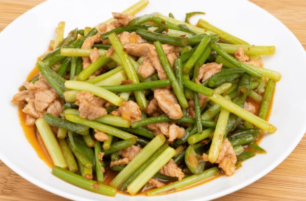 【香椿炒雞蛋】 食材:香椿、雞蛋、鹽、油 1、香椿的老的部分摘掉,然后將其放入水中,清洗干凈。鍋內加水燒開,放入香椿煮幾分鐘,直到變綠后,撈出過涼水。 2、將水分攥干后,將其切碎,切碎后倒入碗中。接下來往碗里打2、3個雞蛋,加少許鹽調味,然后攪拌均勻。鍋里倒油,燒熱后將其倒進去,等定型后翻動,炒成小塊后,盛出鍋開吃。 二、蒜苔 春天,是吃蒜苔的季節,4元一斤也不貴,值得多吃。 它可是被譽為“天然青霉素”,常吃增強免疫力。爽脆又鮮美,和肉一起炒,特別下飯,無論是老人、大人還是孩子,都值得多吃。