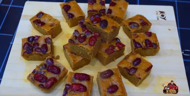 第四步:等面糊醒發好之后,開蓋的時候可以看到面糊變成2倍大了,用勺子攪拌一下,把空氣排掉,再放入掰碎的紅棗干,再次攪拌均勻,讓紅棗干和面糊混合在一起。 第五步:準備一個方形模具,然后將混合好的面糊倒入模具里面,用勺子鋪平,再在上面擺上一層紅棗干,既好看又可以增香。 第六步:起蒸鍋,等蒸鍋上汽之后,放入裝有食材的模具,蓋上蓋子,大火蒸40分鐘。 第七步:在蒸制的過程中,面糊的水分會慢慢蒸發,面糊會慢慢地膨脹,越蒸越多,蒸好之后,出鍋放到桌面上,將它放涼至不燙手,再改刀切成均勻大小的小塊。 這樣一道軟糯香甜,好吃又解饞的【紅糖發糕】就制作完成了,喜歡這道美食的朋友們,就跟著做來試試看吧,保證這個味道不會讓你失望的。