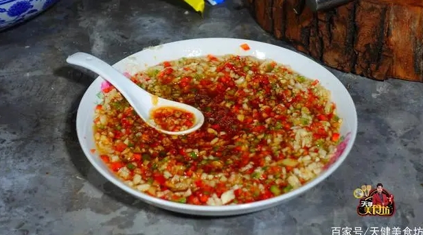 接下來做蒜汁,生姜大蒜先拍扁,然后一起剁碎裝盤備用,再把青紅椒切成碎料,也一起放到盤子里面,攪拌均勻,用熱油爆香,調味加1茶匙食鹽,3湯匙生抽,1湯匙蠔油,攪拌均勻就可以了!