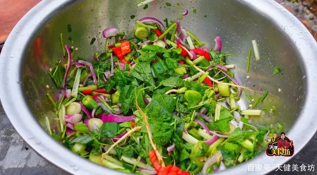 第二步:將所有的食材配料(青紅椒各1根、芹菜、洋蔥半個(gè)、生姜、大蒜)等全部切碎,切碎之后放到盆里面,然后加入2湯匙食鹽,再用手抓勻,然后放著殺一下水備用!