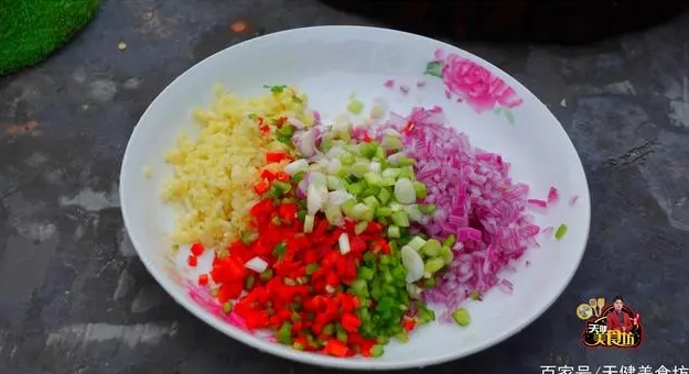 第三步:準(zhǔn)備一點(diǎn)碎料,把部分青紅椒、生姜、大蒜、洋蔥等,切碎,裝盤備用!
