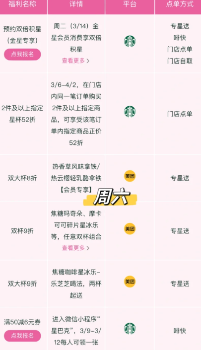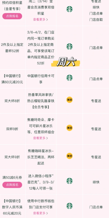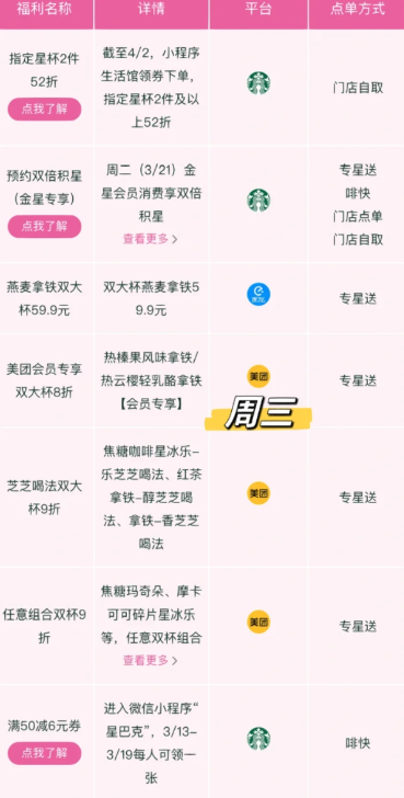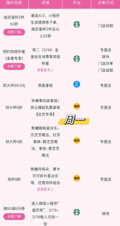 星巴克買一送一的活動2023現在暫時還沒有,目前的優惠活動如下: 門店: 周一:如圖