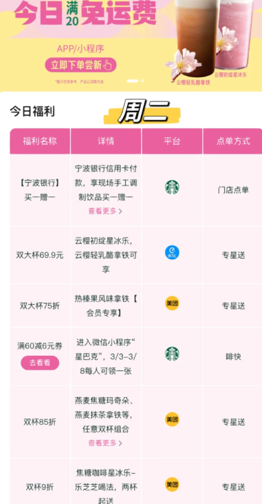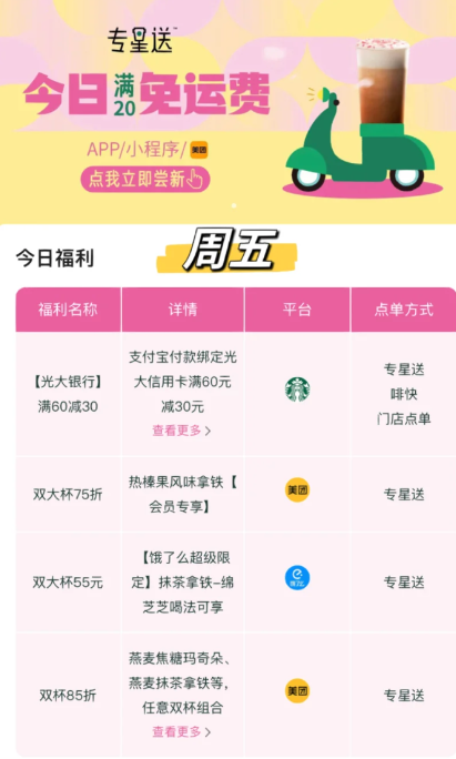 星巴克買一送一是比較常見的優惠活動,如果能夠遇到星巴克買一送一的話還是很香的,今年星巴克官方并沒有推出買一送一的活動,但是外賣可能會出現,大家可以實時關注下!