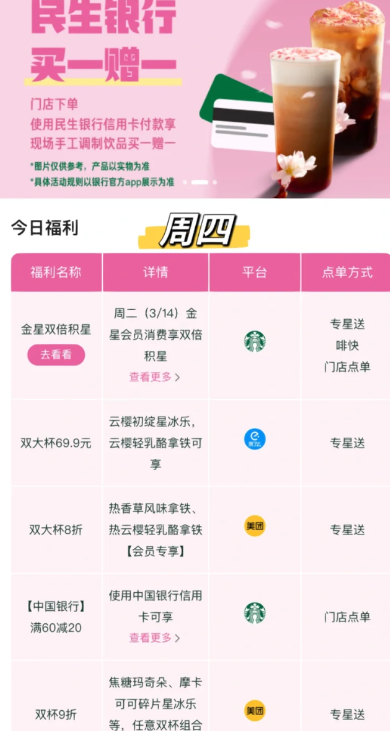 周四:門店民生銀行信用卡買一贈一(活動到3.30),中國銀行信用卡滿60-20