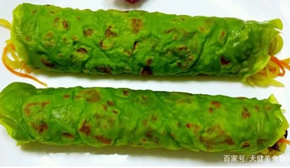 NO.5 菠菜餅 準備食材如下:菠菜200克,低筋面粉150克,雞蛋1個,色拉油適量,食鹽1茶匙,雞精1茶匙,香油適量 具體做法如下:菠菜放入有鹽的開水中焯燙,切斷,放入料理機中加適量水榨汁,榨好的汁中打入一粒雞蛋,加入適量的面粉,清水,鹽,雞精,香油和色拉油攪拌均勻(調到自己滿意的顏色為準),稀面糊調到以勺子舀起能快速落下比較好,電餅鐺開下盤,不放油,舀上面糊,薄薄一層即可,看凝固表面變色,翻面稍微煎下就可以了,吃的時候裹上自己喜歡的果醬,配個豆漿牛奶的,呵呵,很健康豐富營養的早餐就好了!