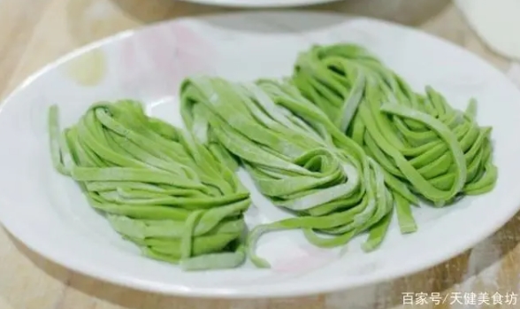 NO.2 菠菜面 準備食材如下:菠菜250克,面粉250克,豬肉100克,茭白1根,胡蘿卜1根,色拉油5克,食鹽2克,生抽10克,水100克,白糖2克 具體做法如下:菠菜清洗干凈,放在加入鹽和油的開水中焯一下。鹽和油的量在原料外。大概鹽1克,油5克。這樣做的目的是為了讓菠菜顏色更好看,焯好水的菠菜放入冷水中,放涼后切成三厘米的小段,放入攪拌機中,加少許的水,攪拌一分鐘,然后過濾,過濾好的菠菜汁,取115克菠菜汁加入250克面粉和成面團,然后搟長。最好用壓面機方便,再搟薄些,切成面條。上面撒些玉米淀粉防沾。面條做好后。放在10倍的開水里煮熟即可,肉末放在油鍋中炒香,倒入切好的胡蘿卜絲和茭白絲,加上調料翻炒均勻即可。吃的時候,倒入菠菜面的上面!