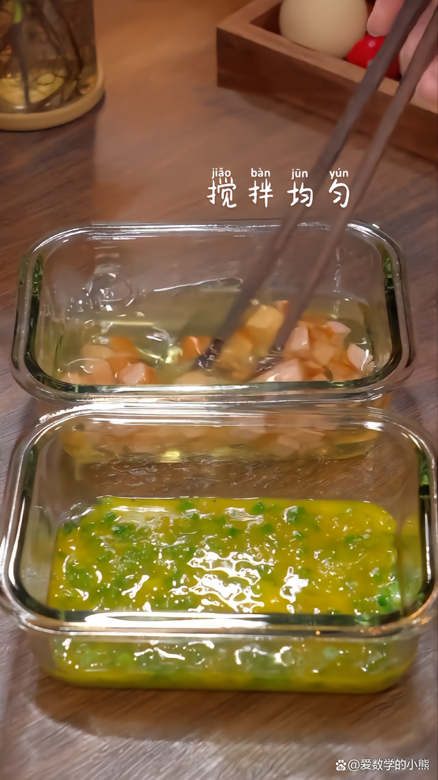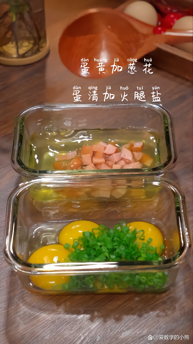 2、蛋黃加蔥花,蛋清加火腿鹽