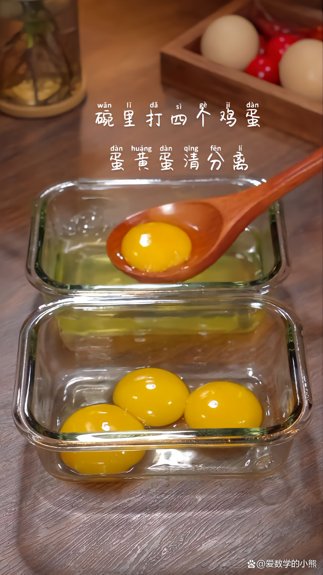 1、碗里準備四個雞蛋,蛋清蛋黃分離
