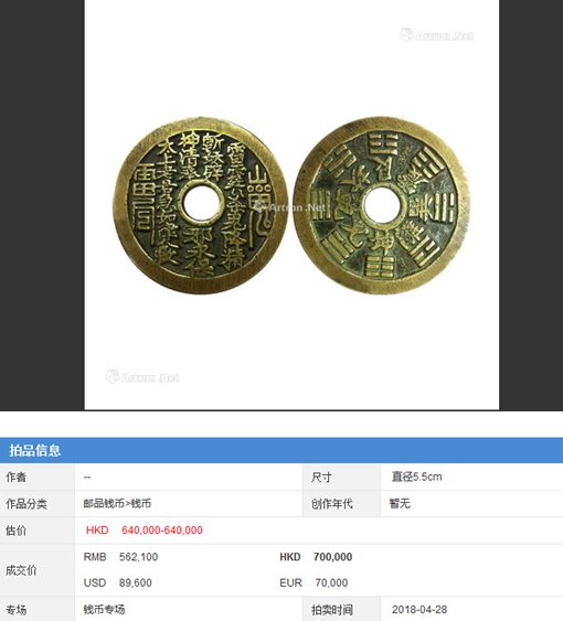 八卦錢在古代并不屬于正幣,更像是一種紀(jì)念幣,并不能在市場上流通,因為鑄造量很少,所以顯得十分珍貴。花錢源于漢朝,當(dāng)時是民間百姓自娛自樂發(fā)明的一種玩錢,因為花錢上會刻有非常豐富的圖案信息,這在當(dāng)時還是非常新穎的,所以引起了很多玩家的關(guān)注。山鬼八卦花錢就集合了八卦錢和花錢的特點,是清末民間鑄造用來辟邪的錢幣,但這種錢幣的價值到了今天已經(jīng)算是天價了。 ![]() 自古以來,山鬼都是以正義、高大的形象存在,以山鬼紋飾、銘文的各種器物也多被人們賦予護佑和辟邪的作用,其中的山鬼花錢,以其小巧輕便、易于佩戴的特點,成為人們最喜聞樂見的一種配飾。 "山鬼八卦花錢"是清末民初時民間造的,山鬼花錢就是辟邪用的,"山鬼八卦花錢"花錢正面是楷 體陽文:山鬼,雷霆殺鬼降魔斬妖辟邪永保神符奉太上老君急急如律令敕。 清代是山鬼花錢流傳最廣的時期,很多人都將其佩戴在帽子、腰帶上,一來其美觀的形象可以作為一種飾品,二來也可以滿足驅(qū)鬼辟邪的心理。除此之外,山鬼花錢也多被用在屋角、影壁之類的地方,作為鎮(zhèn)宅之物,而帶有八卦圖案的山鬼花錢,更是其中的上品! ![]() 將“八卦理論”鑄進錢幣,反映了古代對《周易》哲學(xué)理論的認(rèn)知和重視,“八卦錢”在發(fā)行時作為“花錢”而并不作流通使用,專供玩賞、紀(jì)念等使用,并非“正幣”,所以版別繁雜的“八卦錢”引不起收藏家特別的重視,但隨著現(xiàn)在收*人群不斷壯大,對山鬼花錢的認(rèn)知度越來越高,近年價格也是水漲船高。 山鬼花錢這枚錢幣屬于民俗花錢,在古代,它們只是一種文化藝術(shù)品,不具備流通性質(zhì),但具收藏、欣賞價值。多用于社會交往,傳遞感情,表達寄托吉祥,除兇避邪的良好愿望和對幸福生活的美好追求。 ![]() 市場近幾年山鬼花錢拍賣成交記錄: 山鬼花錢----估價60.00到60.00萬-----拍賣日期:2017年5月31日www.ws46.com 八卦山鬼花錢----估價120.00到120.00萬-----拍賣日期:2017年5月28日 山鬼花錢----估價249.40到249.40萬-----拍賣日期:2018年1月26日 ![]() 山鬼花錢----估價88.00到88.00萬-----拍賣日期:2018年5月23日 清早期山鬼花錢----估價235.00到235.00萬-----拍賣日期:2018年1月5日 ![]() 山鬼花錢----估價108.00到108.00萬-----拍賣日期:2018年5月31日 清代山鬼花錢(一件)----估價158.00到158.00萬-----拍賣日期:2018年5月7日 |