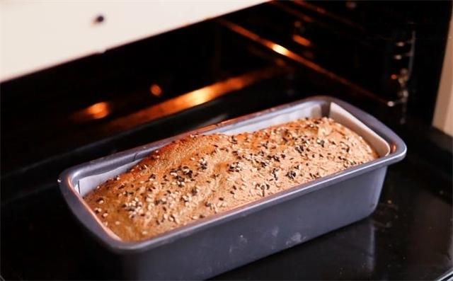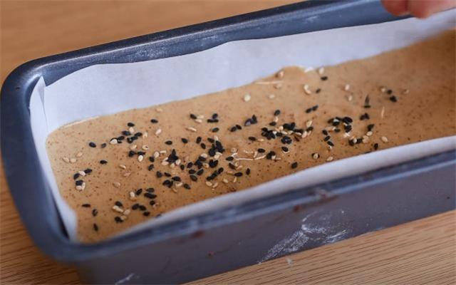 4.攪打好之后直接倒在鋪有油紙的模具里面,最后的時候表面撒一些黑白芝麻。