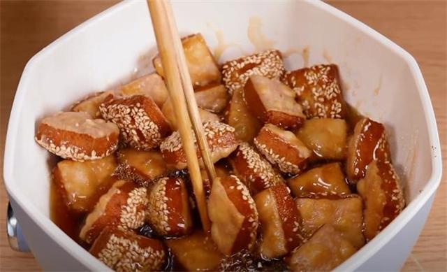 11.這個(gè)是提前熬好的糖漿,炸好之后直接放在里面浸泡30分鐘左右,糖漿的做法:200g麥芽糖、200g白糖、150g清水,小火煮至沸騰冒大泡即可。