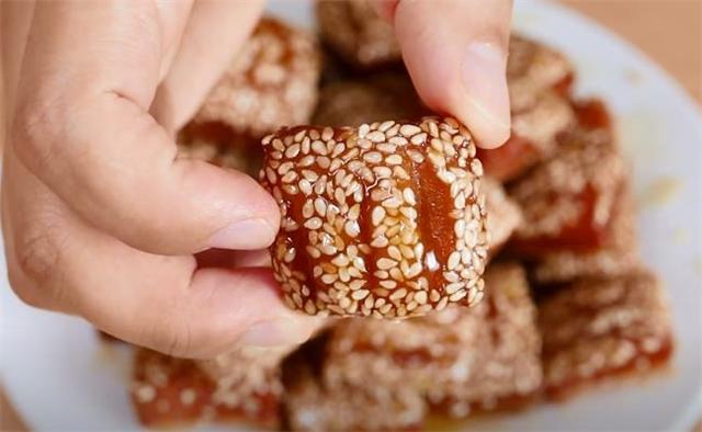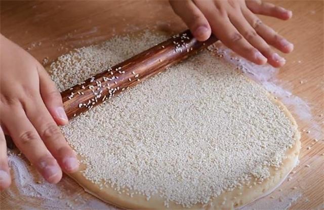 7.這時(shí)候繼續(xù)在表面刷水,盡量的多撒一些芝麻,這樣炸出來的味道會(huì)更香,再稍微的搟一下,這樣芝麻可以粘的更牢固。