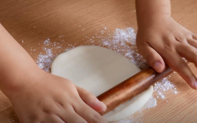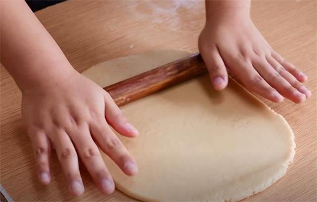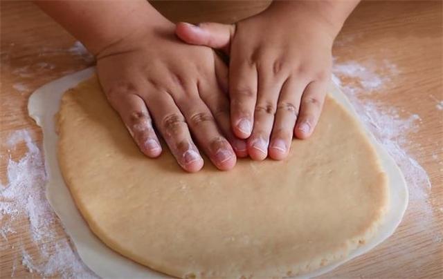 5.現(xiàn)在我們?cè)賮硖幚碛推さ牟糠郑赴迳先鲂└擅娣鄯勒常瑩{成和酥面同樣的大小。