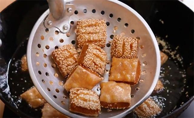 10.油溫六成熱的時(shí)候下鍋,全程小火慢炸,最后的時(shí)候一直炸到膨脹浮起,顏色比較深的狀態(tài)就可以出鍋了。