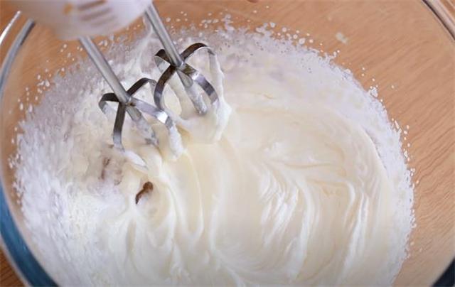 6.我們來打發(fā)淡奶油,奶油放180g,白糖20g,持續(xù)打到這種發(fā)硬,而且有紋路的狀態(tài)就可以了。