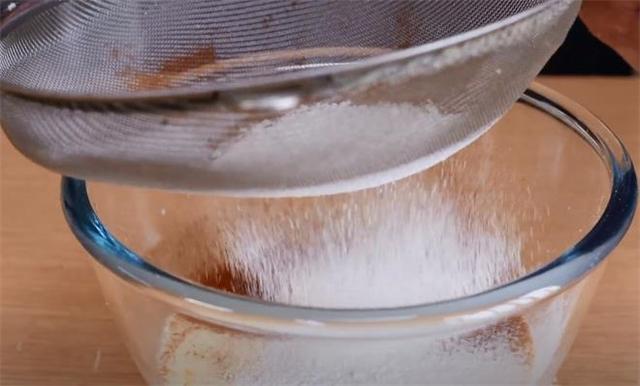 2.然后拿一個(gè)篩網(wǎng),110g低筋粉,8g的可可粉,全部篩一下。