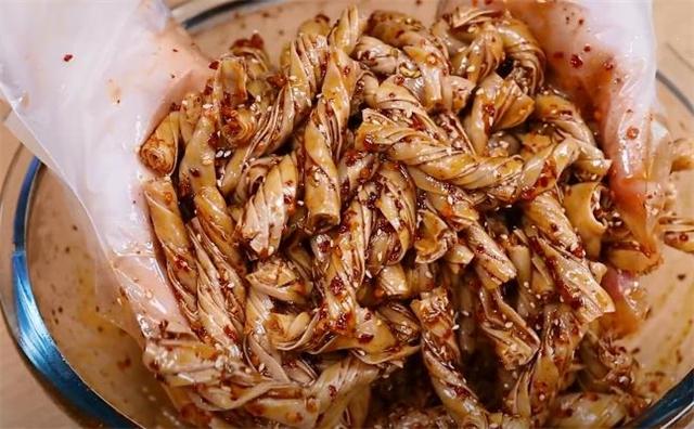 7.辣椒油稍微放涼和豆棍摻在一起,用手抓勻即可開吃,麻辣爽口,越吃越過癮,學會的小伙伴趕緊在家試試吧。 |