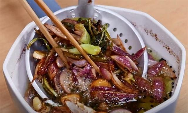 4.現在我們做調料油,油熱之后加香菜、小蔥、八角、草果、大蔥段、姜片、洋蔥、花椒,最后的時候一直炸到這種干癟的狀態,我們這個調味油就做好了,把殘渣撈出來。