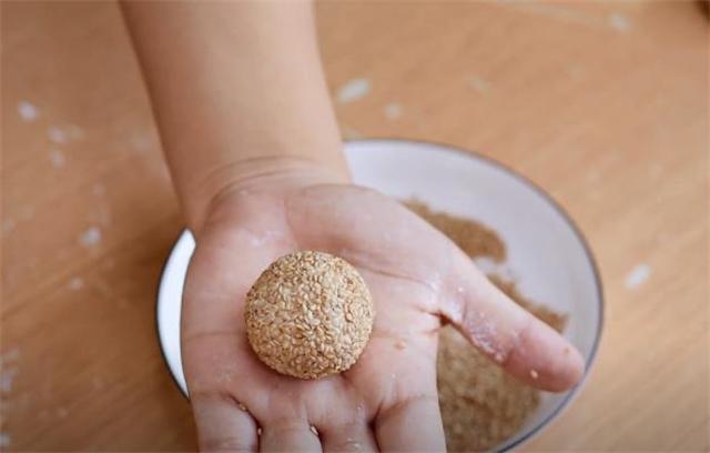 4.先沾一層清水,然后再裹一層白芝麻,再稍微的團一下,我們這個劑子就做好了。