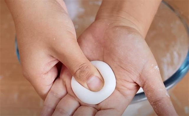 2.下劑子的時候直接揪一小塊出來,在掌心稍微的團一下,然后用大拇指向下按一個小坑。