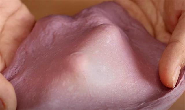 3.再把面團放在案板上繼續揉,最后一直揉到能扯出這種薄膜就可以了。