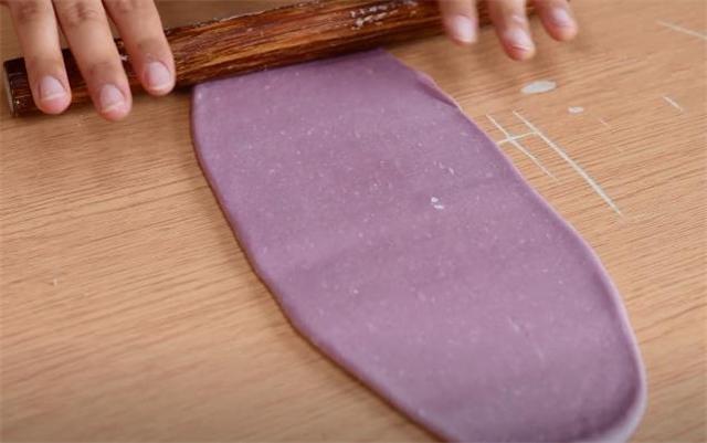 5.切完劑子之后,我們利用手掌簡單的收攏一下,再用搟面杖搟成牛舌狀。