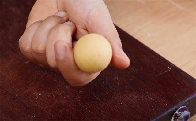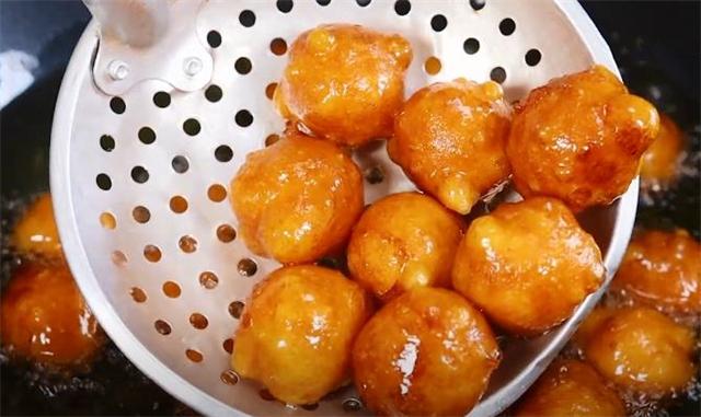 5.炸丸子的時候我們油溫大概在七成熱的時候下鍋,炸的時候我們一定要全程小火慢慢炸,也要多翻動,別讓它們粘在一塊,最后小火一直炸到發硬,顏色變得金黃就可以控油出鍋了。