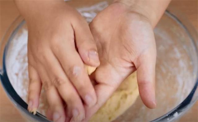3.都搗成泥之后,我們開始少量多次的放糯米粉,整體的糯米粉不要加太多,會影響口感,看到成顆粒狀我們就來揉面,這個面團揉到不粘手又軟軟的狀態的時候,我們直接揪一小塊出來在掌心團圓。