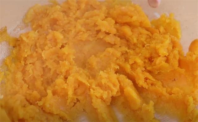 2.趁地瓜還熱的時候,我們少量多次的加一些白糖,用勺子搗成地瓜泥。