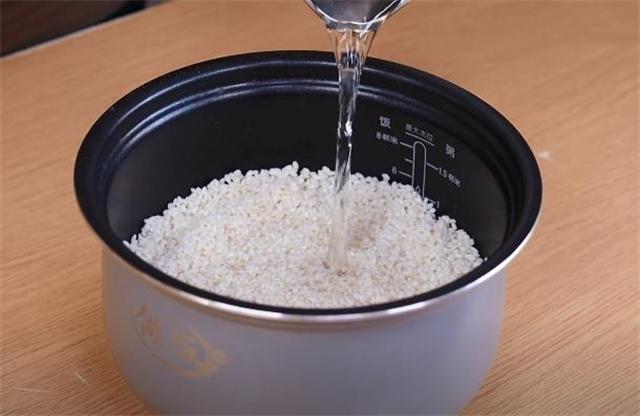 2.把糯米倒進電飯鍋,加入適量的清水,按照平時蒸米飯的程序把它蒸熟。