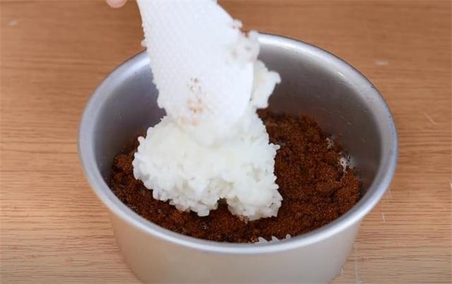 3.大約30分鐘的時間,糯米已經蒸熟了,拿一個模具出來,里面刷上油防粘,在底下先鋪上一層糯米飯,然后再鋪上一層紅糖。
